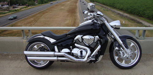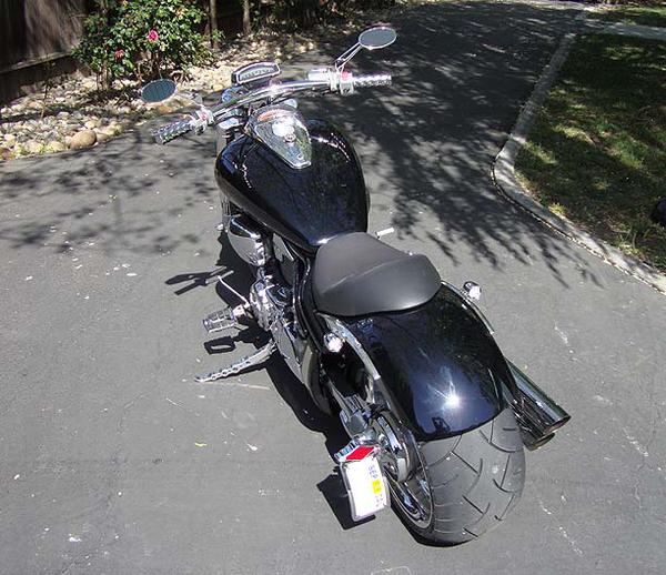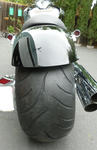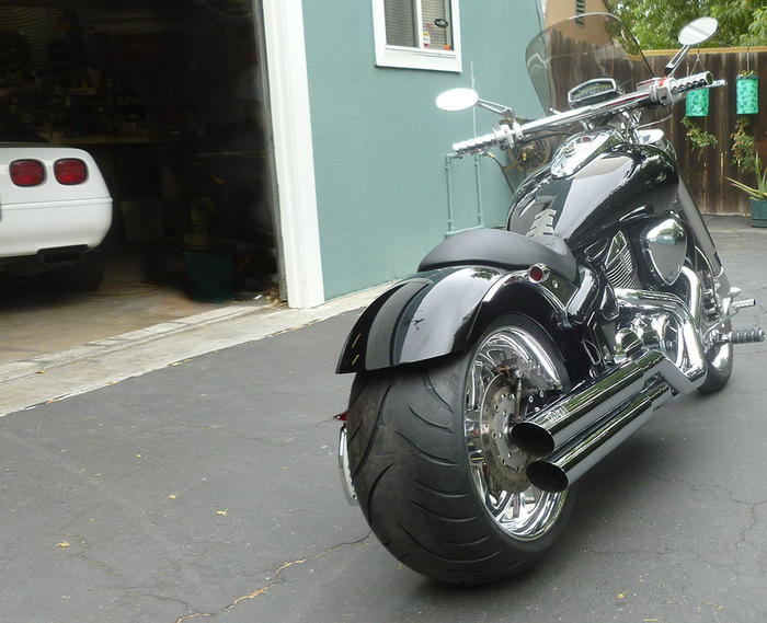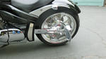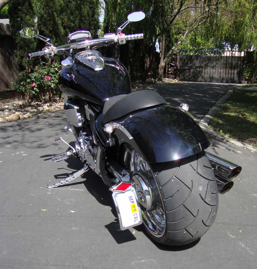 4/24/10 - 6 degree triple trees, 21" front wheel/ 120/70-21 tire, 10" wide rear wheel/Metzeler 280 tire, Sumo-X rear fender/struts, and new V&H Big Shots exhausts.